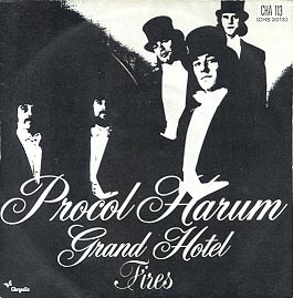 The single received suitably wide promotion: Grand Hotel / Fires (Which Burnt Brightly) (Chrysalis CHS 2013) was released in the USA in July 1973. Promotional copies contained only Grand Hotel (one side the edited version 4:18, the other side the album version). Grand Hotel was also released as a single in France (CHA 113), Netherlands (5C 006-94 347), Germany (6155 010) - this has the 4:18 edited version and a cover featuring Dave Ball - and Portugal (6155 023). The song can also be found in a 7:50 version on the Over The Rainbow album (recorded 16 March 1975) and a 6:43 version on The Long Goodbye album (July 1995) sung, not to every fan's taste, by Jerry Hadley. Two excellent versions were broadcast in TV specials: Welcome To Grand Hotel (Belgian TV, July 1973) and Musikladen Live (1974), which is available on video and DVD (Pioneer Artists) and is thought by many fans to be the best Procol footage ever!