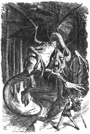 'Worm' is the old term for lowly creatures in general including snakes; it was originally spelt 'wurm' and is probably of Teutonic origin. ('Worm' and 'snake' are still interchangeable put-downs in conversation: 'you behaved just like a snake'). Folklore supplies heroes like St George, who defeated the dragon, or St Patrick, who cast the snakes out of Ireland: these feats have been explained in geomantic terms and have their equivalents in the lore of feng-shui. Lewis Carroll's Jabberwock, in the famous illustration by Sir John Tenniel, gives us forest, hacking sword, and a monster whose receding tail becomes ever more worm-like: this frightening, resonant image can surely be found deep in any literate British child's mind and its by no means the only indication we have that Reid knew his Carroll.