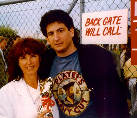 | At the entrance gate before the show: Franky Brooker with Unsteady Freddie, the latter wearing a rather nice tee-shirt showing the original graphic design for Player's Navy Cut tobacco, upon which the famous cover of the A Salty Dog album was based. To see another spoof of this advertisement, click here |