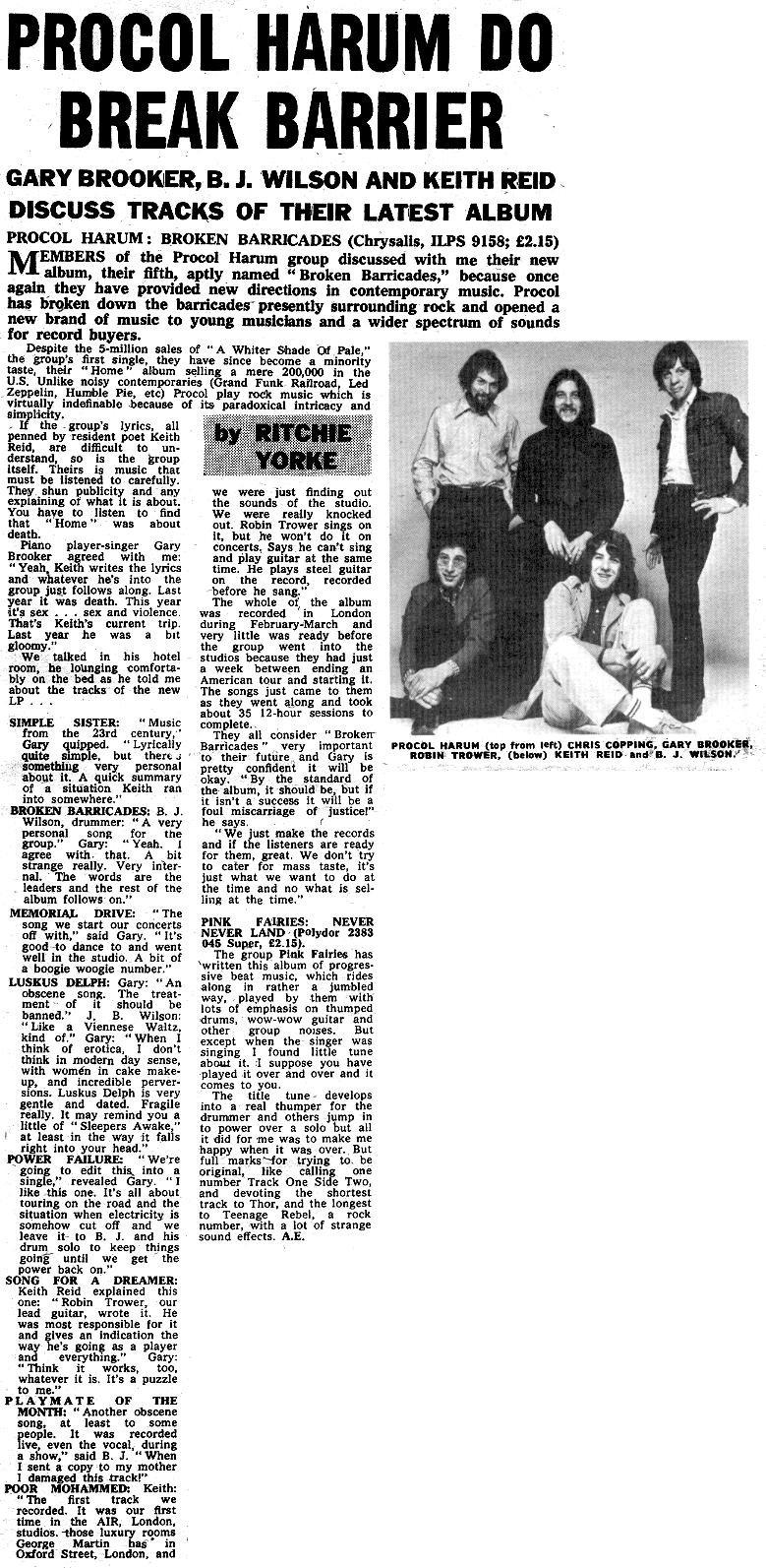These excerpts from New Musical Express, kindly selected for 'Beyond the Pale' by Yan Friis, show the release and the chart success of Broken Barricades, several Trower-induced personnel changes ... but the non-return of Matthew Fisher.