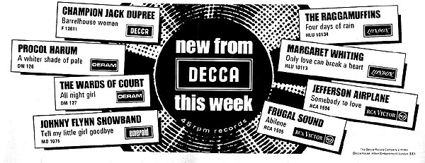 Procol Harum: A Whiter Shade Of Pale (Deram). A gripping blues-tingled ballad, warbled in heartfelt style by the soloist. Outstanding backing highlights some delicious organ work. Hummable, thoroughly impressive.