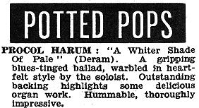 These excerpts from New Musical Express, kindly selected for 'Beyond the Pale' by Yan Friis, provide an evocative summary of the pop-music climate into which Procol Harum emerged. This little review and advert must be among the earliest printed references to A Whiter Shade of Pale.